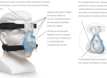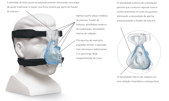 Graças ao projeto exclusivo do almofadado duplo e à tecnologia Auto Seal, o ajuste de uma ampla variedade de pacientes é quase imediato. A parte almofadada interna se adapta rapidamente aos contornos faciais para criar uma vedação instantânea e autoajustável, quase eliminando a necessidade de ajustes do almofadado da ponte de nariz e suporte de testa. O almofadado externo proporciona apoio, permitindo que a máscara descanse suavemente na face do paciente, eliminando a necessidade de apertar demais o fixador da máscara para obter uma vedação adequada. O fixador da máscara tem travas para facilitar a adaptação e o ajuste, que podem resultar em um ajuste inicial correto e menores reajustas devido a problemas de vedação.