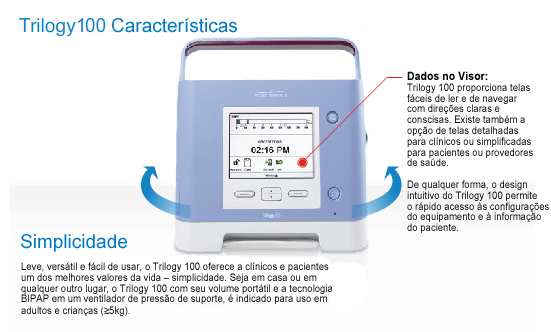 Seja ele usado em titulação hospitalar ou em casa, o Trilogy100 tem uma interface intuitiva que combina facilidade de uso com acesso a altos níveis de versatilidade e desempenho.