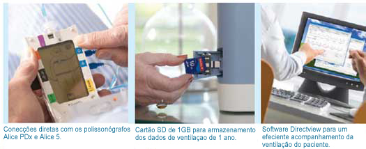 O Trilogy100, através de conexão direta com o Alice PDx e Alice5, oferece informações detalhadas sobre a ventilação do paciente em paralelo com sinais polissonográficos (SpO2, EMG, ECG etc.).